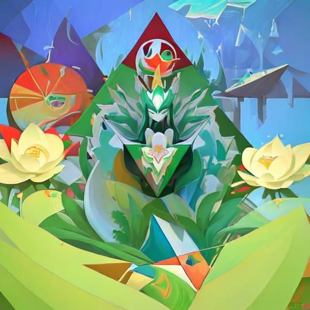 A Cubist-style painting depicts a Buddhist monk in meditation on a pond filled with lotus blossoms. The scene features animal-shaped clouds and a pastel color palette.
