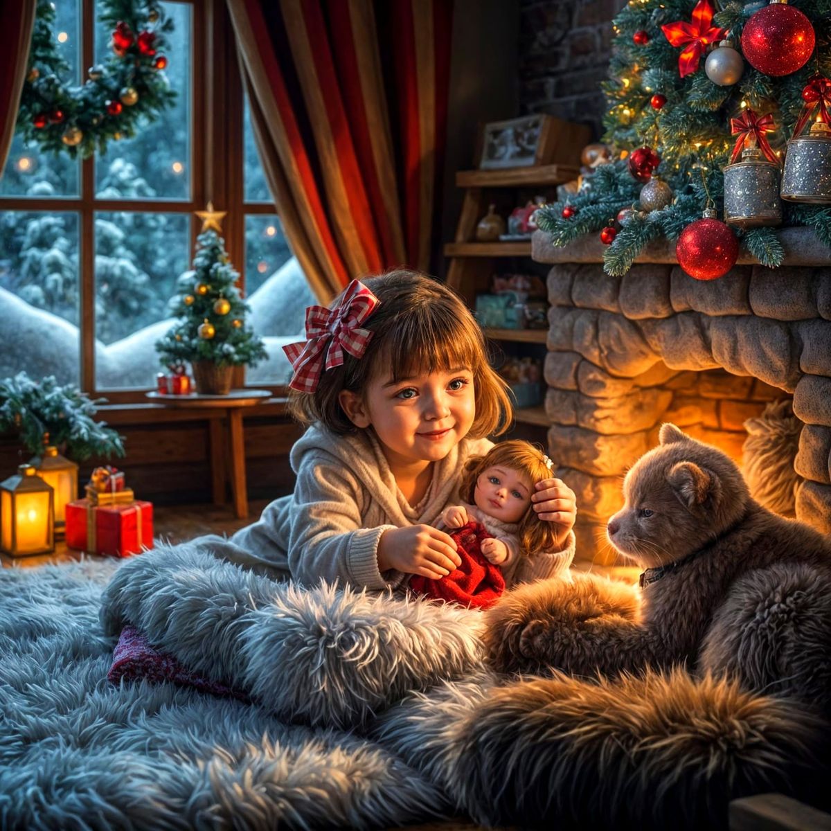 This image shows a young girl playing with a doll on a rug in a Christmas-decorated room. A pet sleeps nearby, with a snowy night visible through the window. Rendered with intricate details and dramatic lighting.