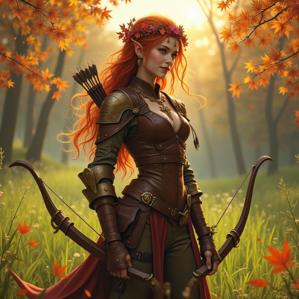 This image shows a fierce yet gentle elven woman in ornate leather armor, standing in a sunlit field. She is adorned with autumn leaves and gold, rendered as dark fantasy concept art.