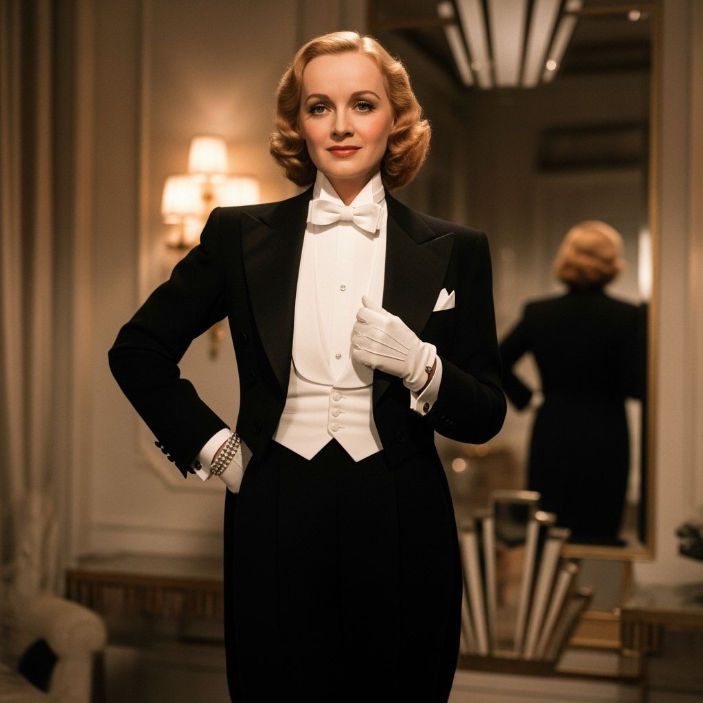 This image shows Carole Lombard elegantly dressed in a black tuxedo. She stands confidently in an art deco room, the soft lighting accentuating her attire and the room's opulent details.