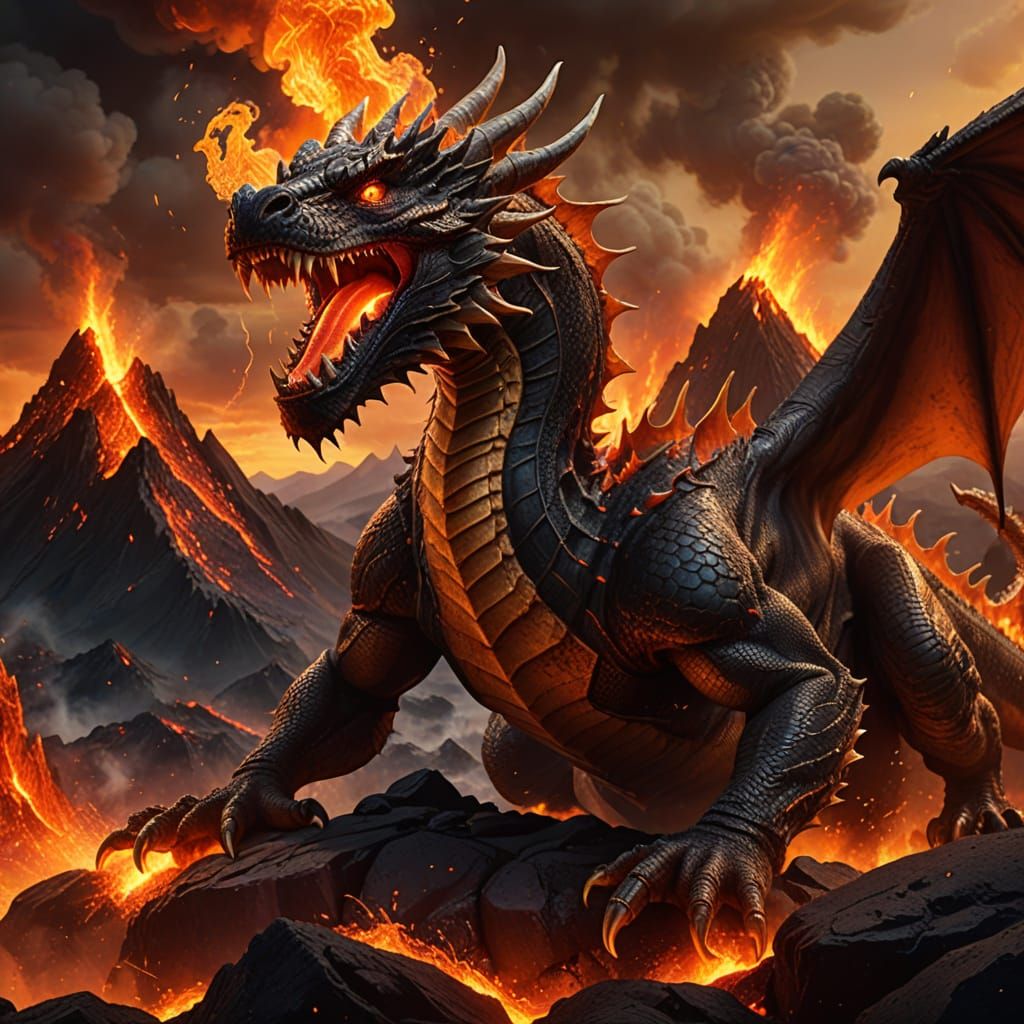 A close-up image of an ancient dragon roaring on a volcano. Fiery scales and molten lava surround the dragon in this hyper-realistic digital artwork with dramatic lighting and a golden hour glow.