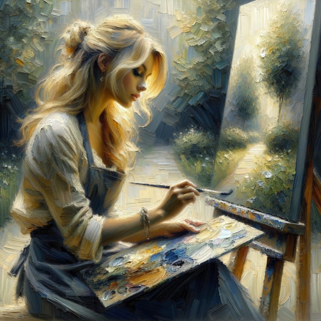 This image shows an impressionistic oil painting of a blonde artist in a garden. It features thick, textured brushstrokes and dramatic lighting, evoking contemplation and creative passion.