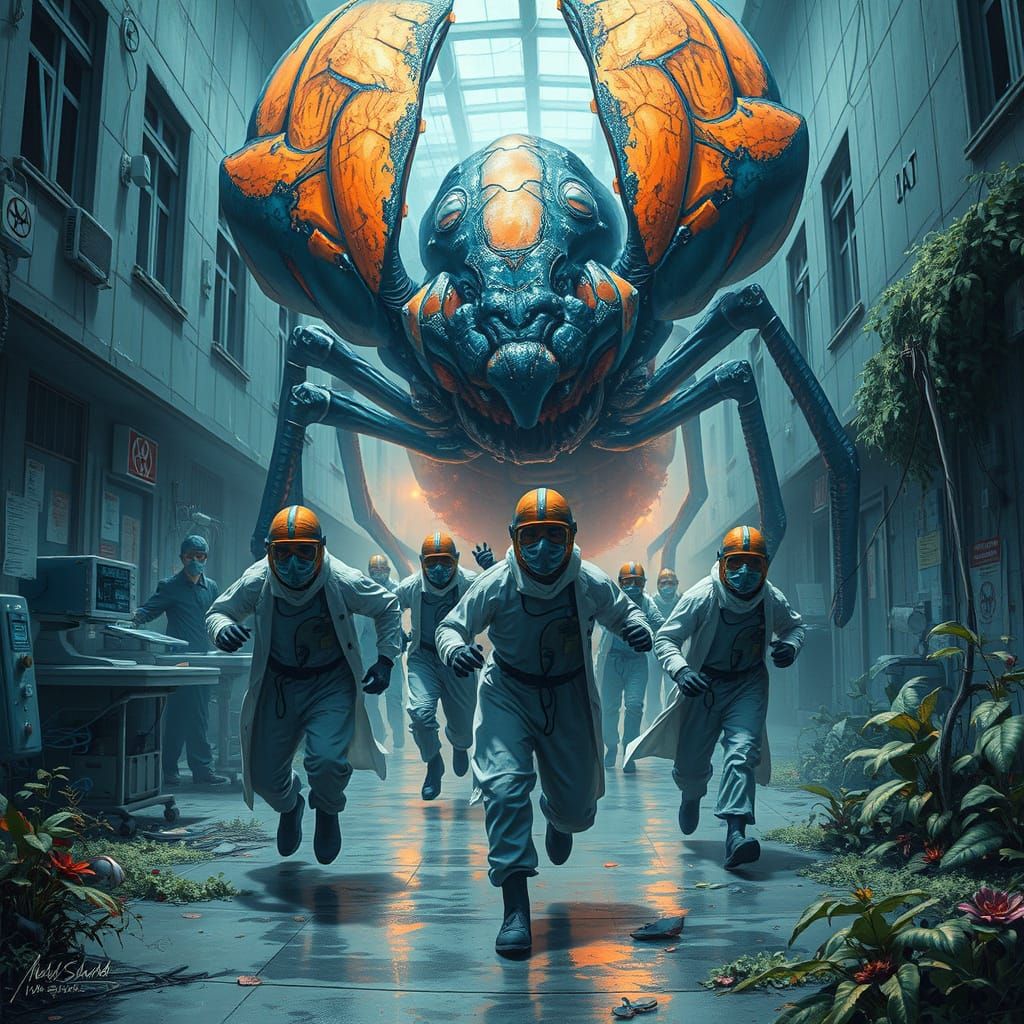 A group of doctors in hazmat suits are fleeing from a giant insect-like creature in a quarantined hospital. The image is a high-contrast matte painting with intricate textures in deep blues and oranges.