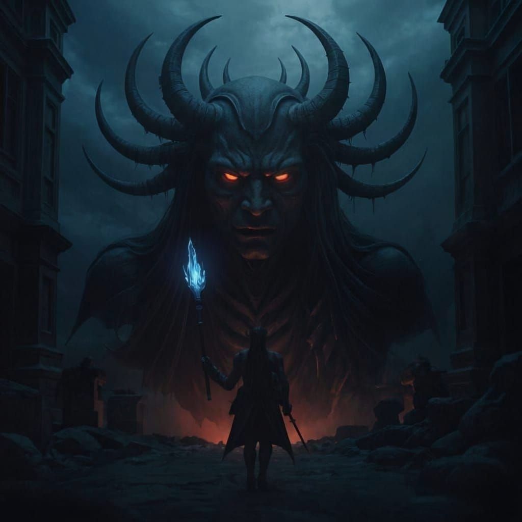 This image depicts an ancient, overwhelming, and malevolent demonic presence, conveying a sense of immense, ancient power.