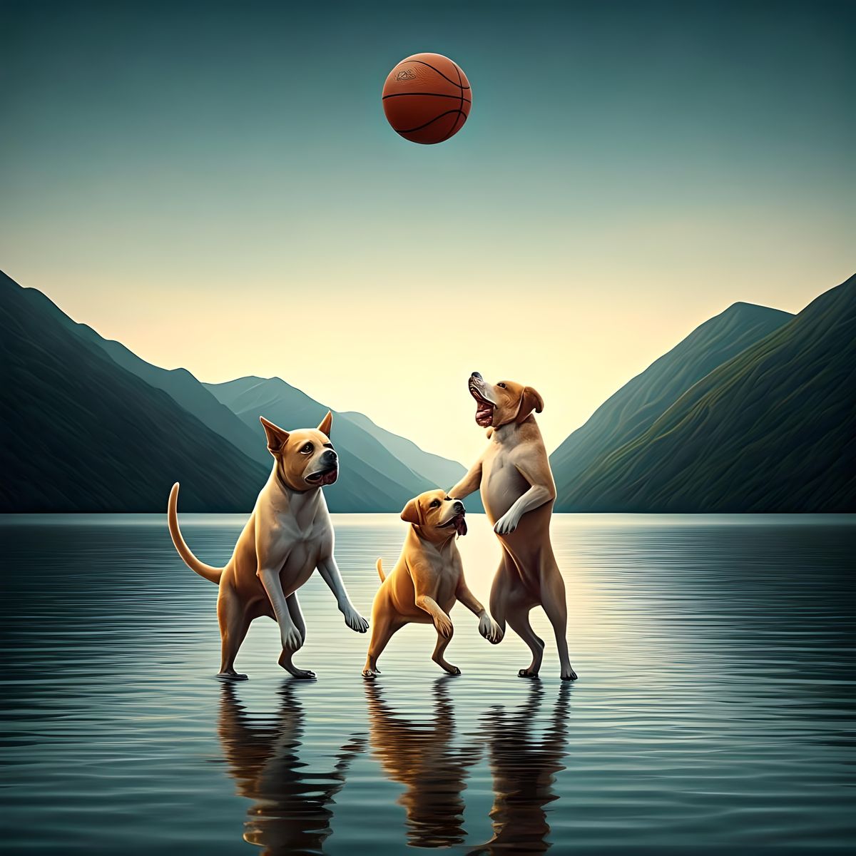 A surreal portrait of dogs playing basketball in a river. The image blends dreamcore aesthetics with an art nouveau style.