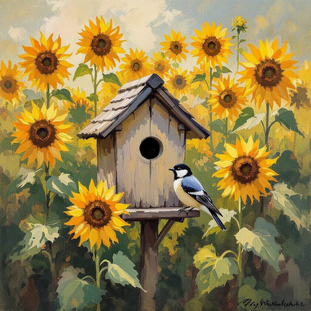 A charming image of a bird feeder surrounded by tall, yellow sunflowers. Rendered in an impressionistic style with soft brushstrokes and naturalistic details, reminiscent of late 19th century art.