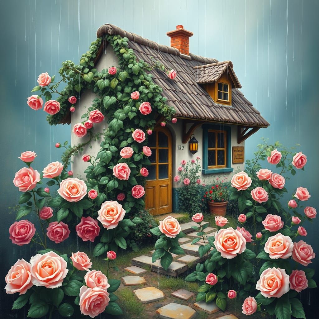 A surreal image of a charming cottage enveloped by climbing vines and a blooming rose garden on a rainy day. The artwork features oil on canvas textures and soft brushstrokes, with a matte background.