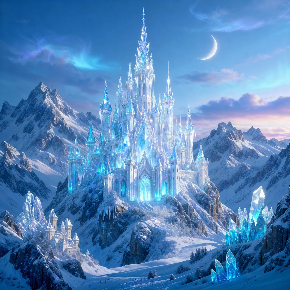 This image shows a grand castle made of shimmering crystals, set against a majestic mountain landscape. Towers resemble icicles or gemstones, with a crescent moon in the twilight sky.