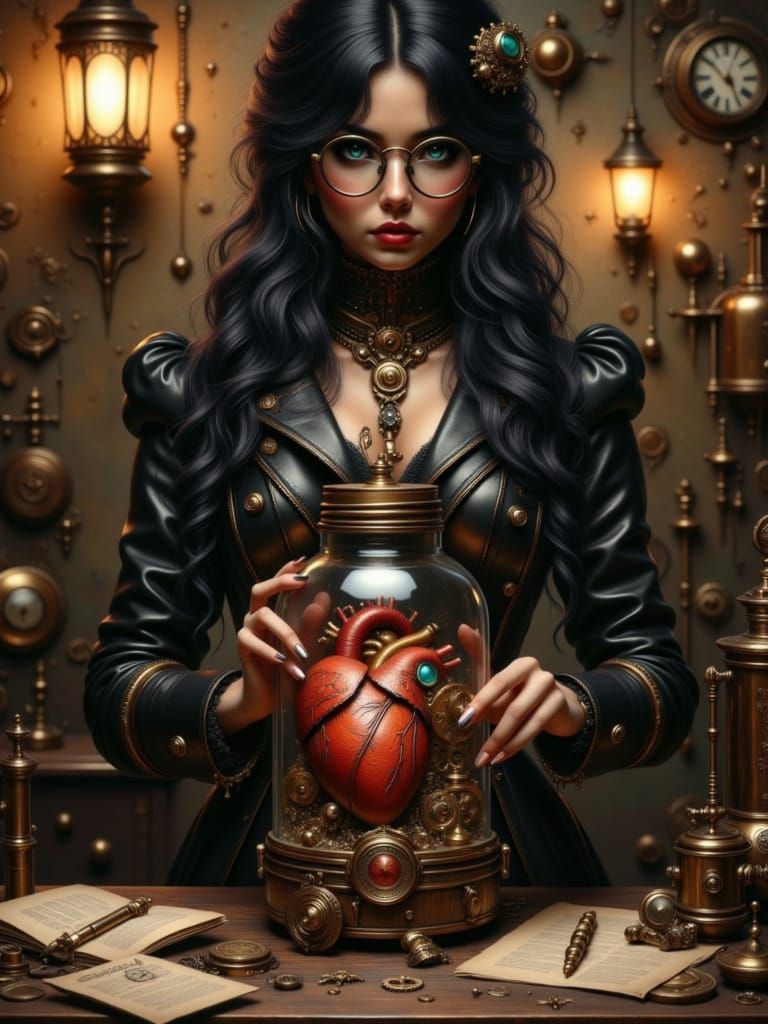 A young woman in a detailed steampunk outfit adjusts a jar containing a human heart and gears. Set in a moody, atmospheric laboratory with gothic elements, rendered with cinematic realism.