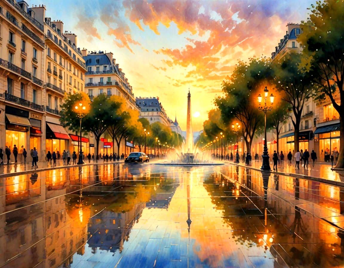 A vibrant photo of the Champs Elysées fountains bathed in the warm glow of a setting sun. The image captures the beauty of Paris at twilight.