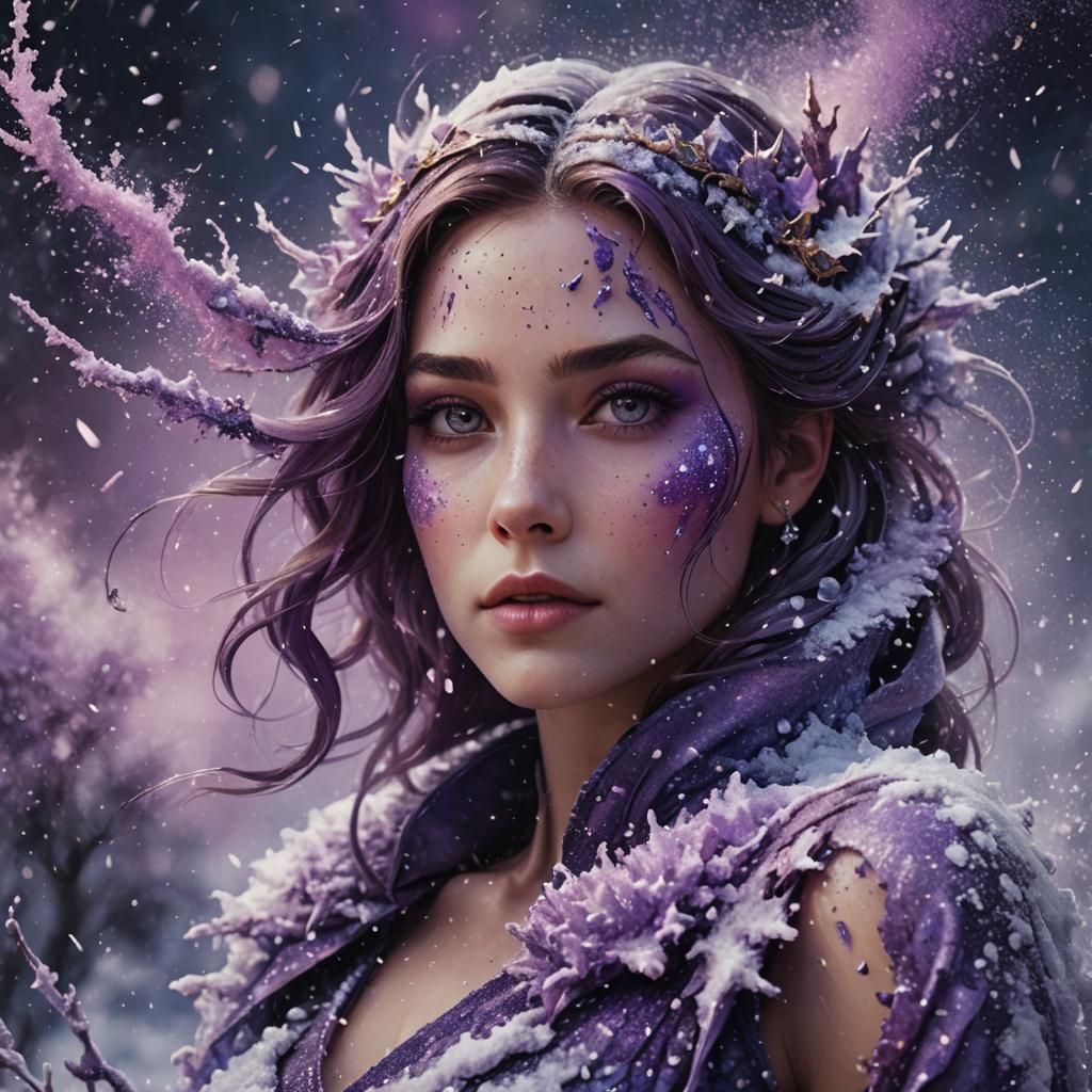This image shows a woman composed of delicate purple snow, with glitter accents. The portrait is reminiscent of watercolor art with deep color, intricate details, and complementary colors.