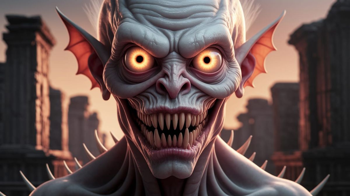 A striking picture of a fantasy horror creature with large, glowing eyes and a deformed head. The image, set against ancient ruins, is rendered in high resolution with warm lighting, creating an ethereal glow.