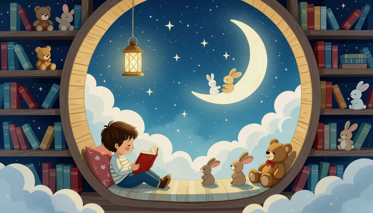 This image shows a child reading in a cozy nook where the walls blend into a starry sky. Teddy bears float like planets in this whimsical watercolor scene with soft, glowing light.