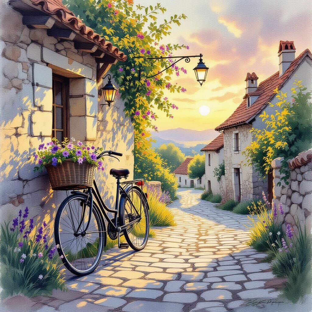 A solitary antique bicycle rests against an old stone wall in a quaint village. Bathed in golden hour light, wildflowers bloom nearby, rendered in a soft, ethereal watercolor style.