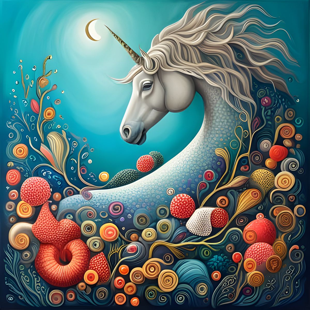 This image shows a unicorn adorned with seashells, starfish, corals, and pearls, rendered in an abstract style with complementary colors and intricate details.