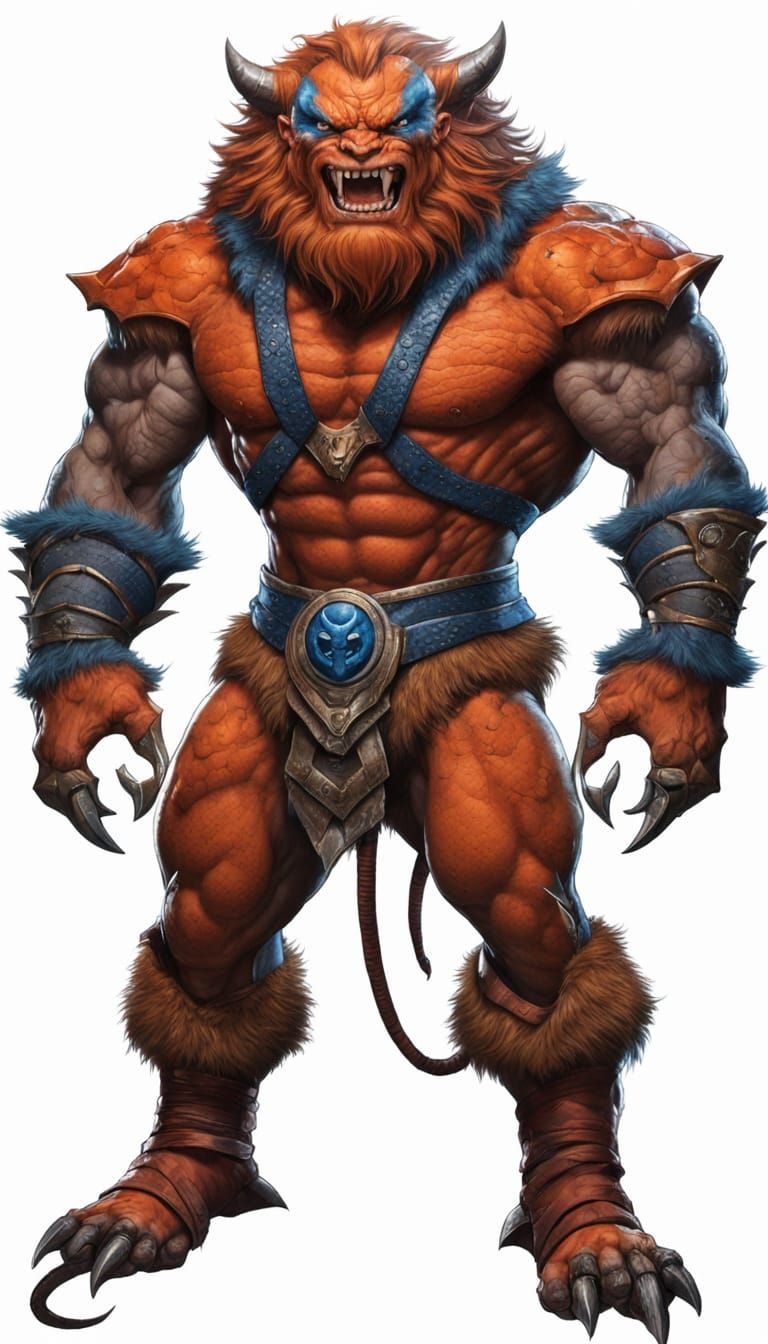 This image depicts a menacing, ultrarealistic beast-man with a sadistic grin. The figure features blue fur, orange armor, and wields a blue mace within a Snake Mountain setting.
