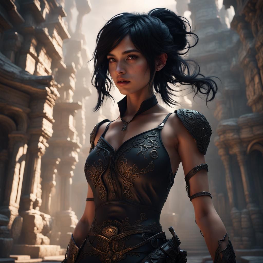 This image shows a black-haired girl manipulating shadows in a fantasy setting. The digital artwork features intricate details, complementary colors, and a deep color palette.