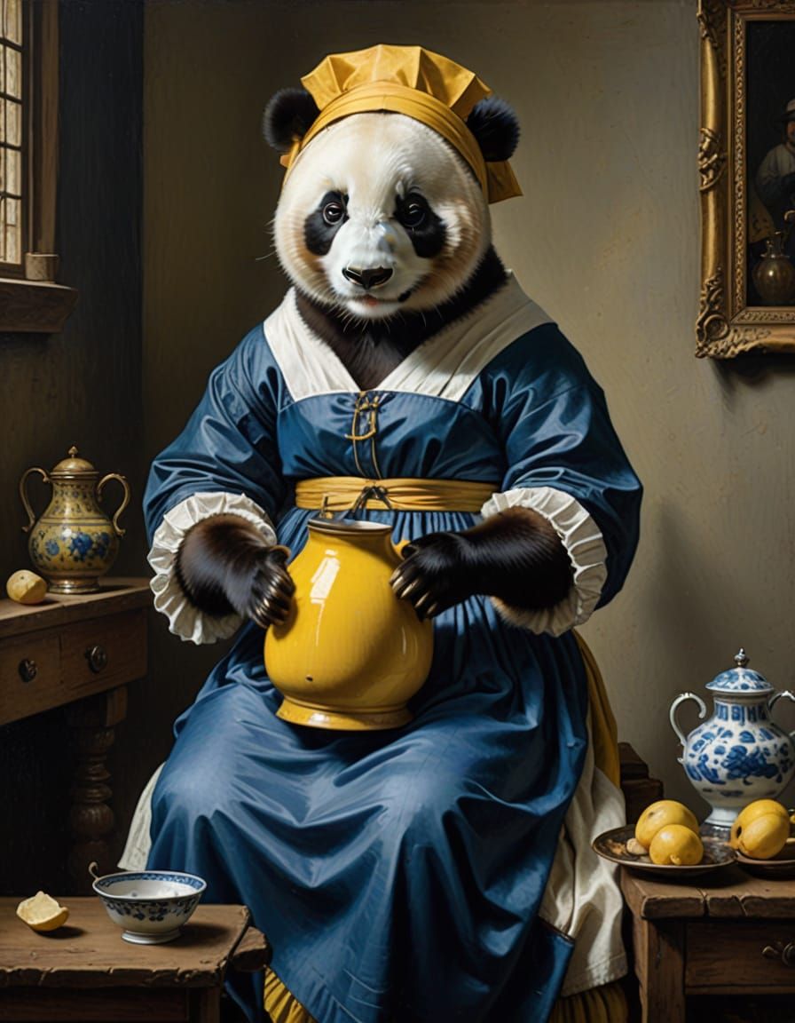 A female panda in a blue dress and yellow camisole holds a jug of milk, inspired by the classic Dutch painting style of Johannes Vermeer.
