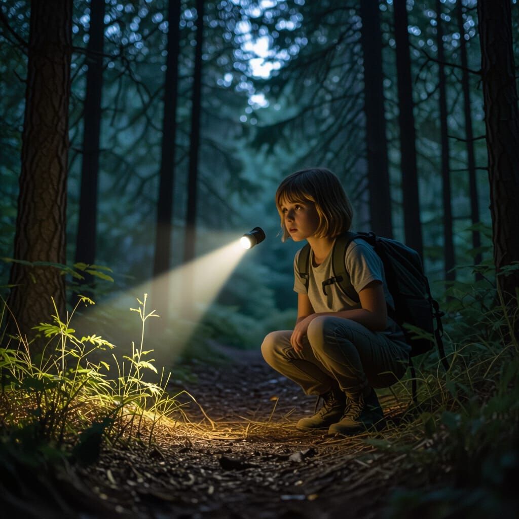 This realistic photo shows a petite, short-haired hiker exploring a dark forest at night with a flashlight, her worried expression illuminated. Eerie shadows and a cool color palette create a tense, cinematic atmosphere.