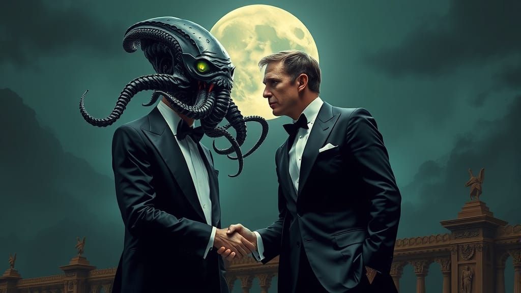This image shows Cthulhu in a tuxedo shaking hands with James Bond in a suit, set against a moonlit backdrop. The scene blends dark, gothic horror with sophisticated style and an eerie atmosphere.