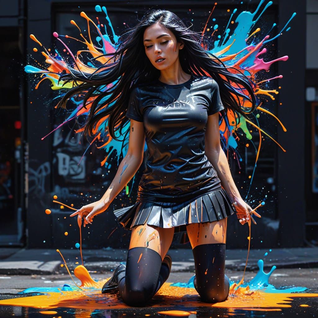 This image showcases a dynamic transgender woman with long black hair dancing on the street, surrounded by vibrant neon graffiti colors reflected in the wet pavement. Created in a hyper-realistic style with melting acrylic textures and polychromatic lighting, this artwork blends street art and splash art...