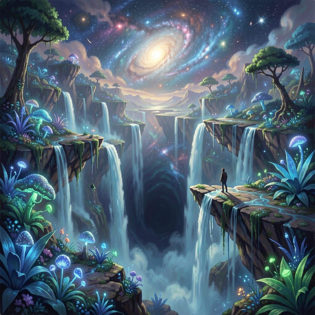 This image shows a surreal landscape with floating islands and waterfalls plunging into a cosmic void. Bioluminescent plants cast an ethereal glow in blues and greens, illuminated by dramatic lighting.