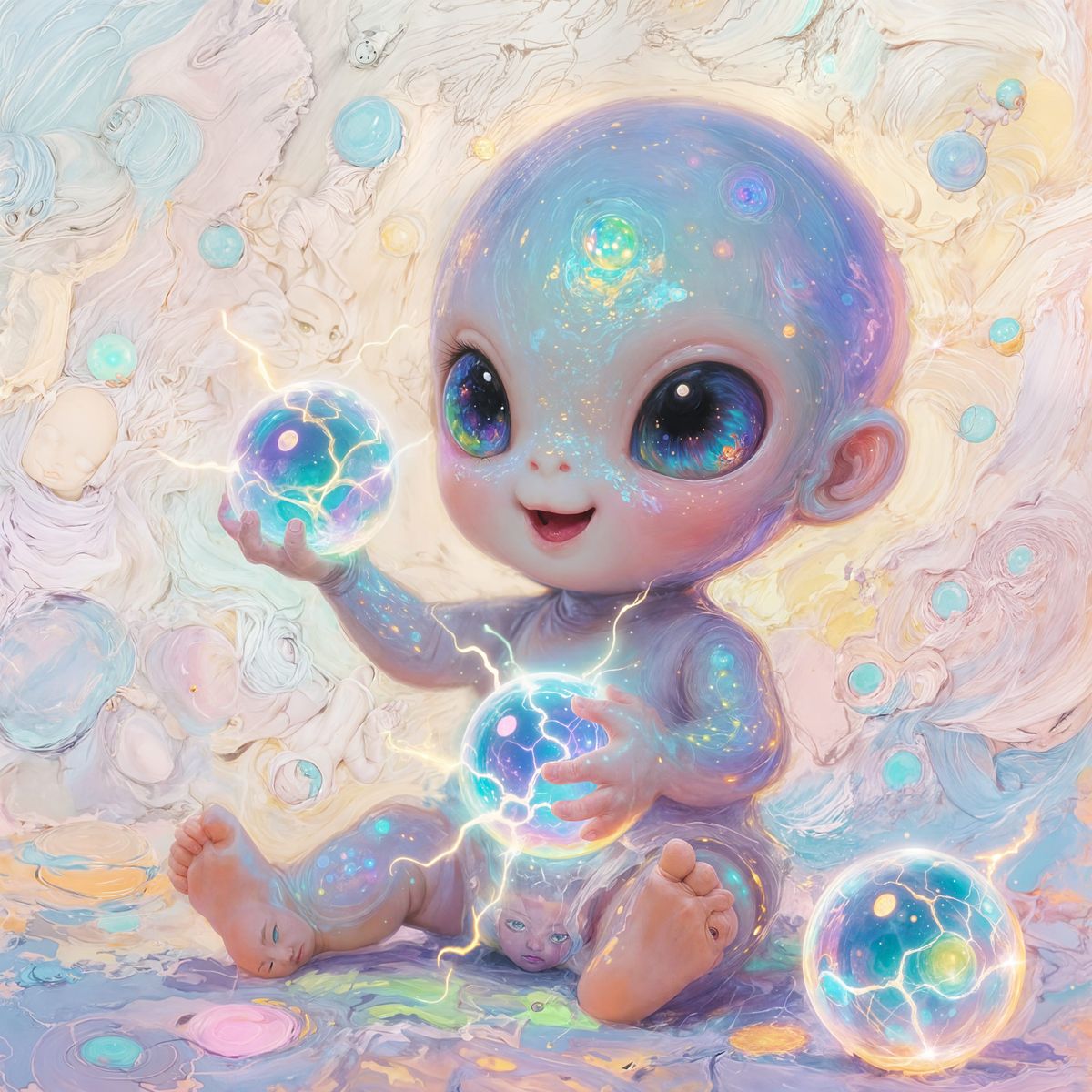 This image features a charming alien infant interacting with glowing plasma spheres, set against a textured background in a doll core aesthetic with soft pastel colors.