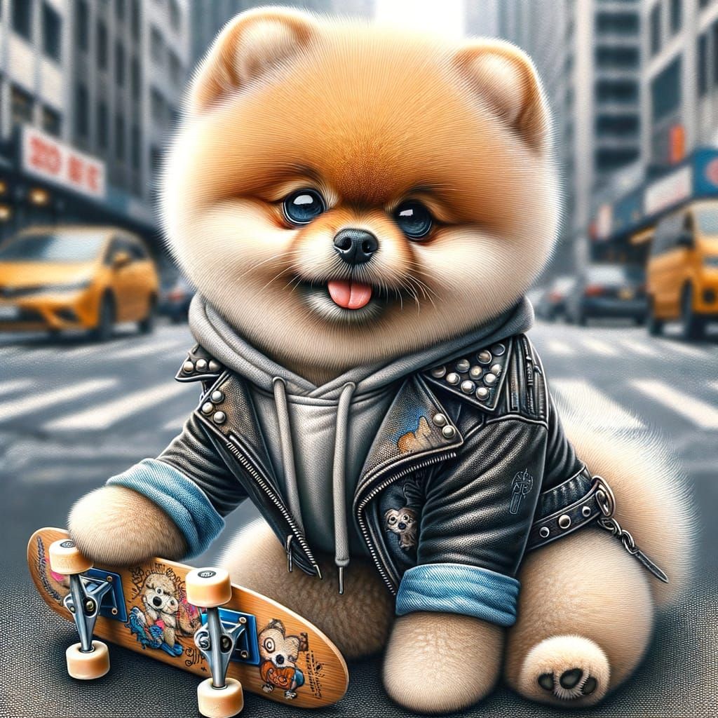 A digital rendering of a fluffy Pomeranian in a leather jacket and ripped jeans, holding a skateboard. The urban background is blurred to emphasize the dog in this high-quality artwork. The style resembles watercolor and airbrush techniques.