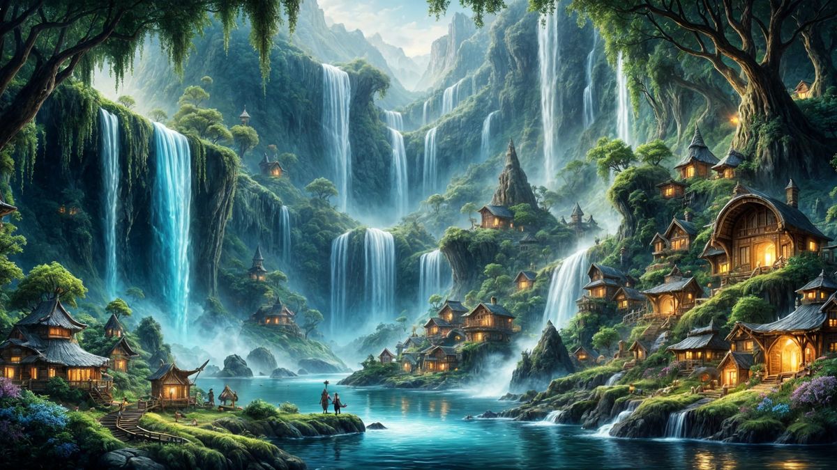 This image depicts a breathtaking fantasy hideaway deep within colossal mountain caverns, illuminated by magical light and adorned with cascading waterfalls, revealing hidden fairy dwellings.
