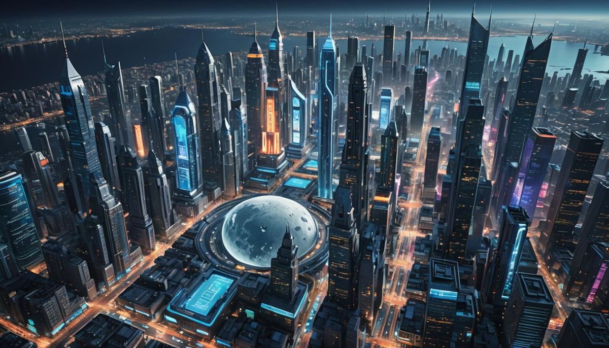 This image shows a futuristic city on the moon with towering skyscrapers and neon lights. The hyperrealistic digital art features glowing blues, holographic advertisements, and the soft light of a lunar sunrise.