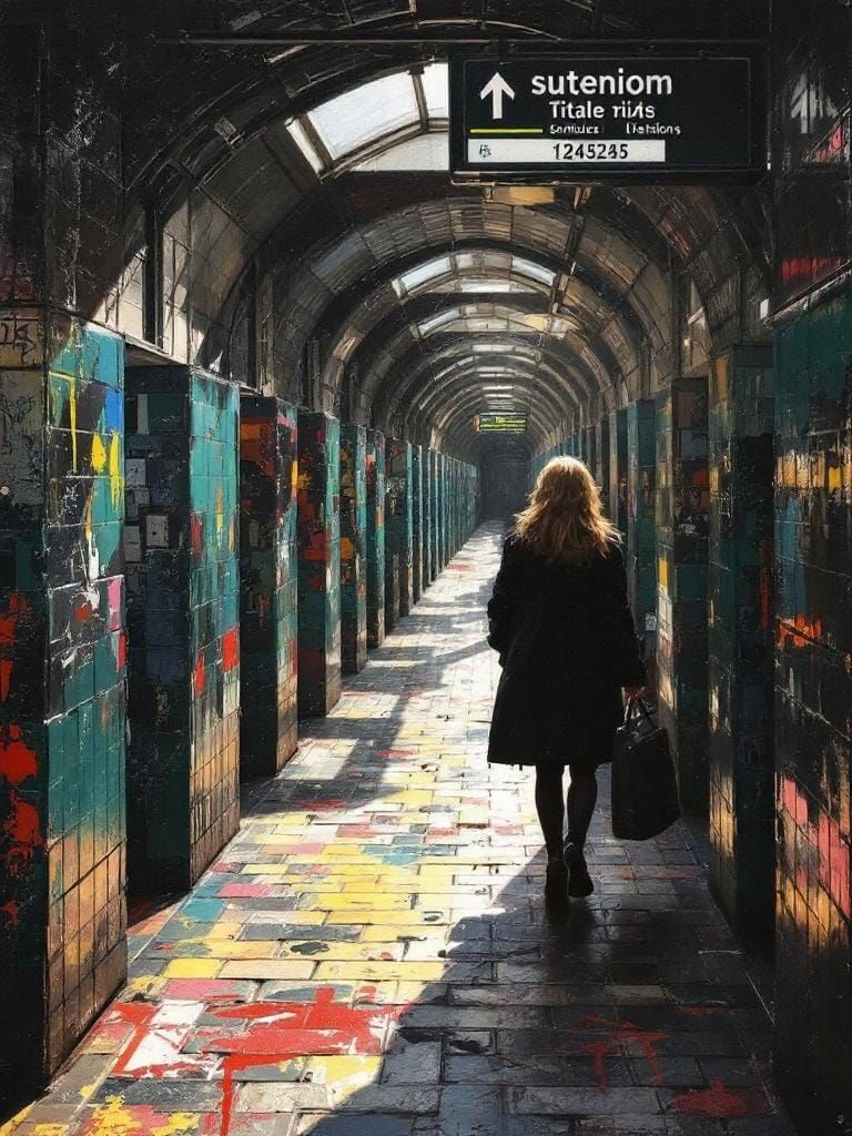 A striking image of an abstract subway station. Thick impasto painting techniques evoke a visceral, energetic feel with dimensional weight and glossy texture in an expressionist style.