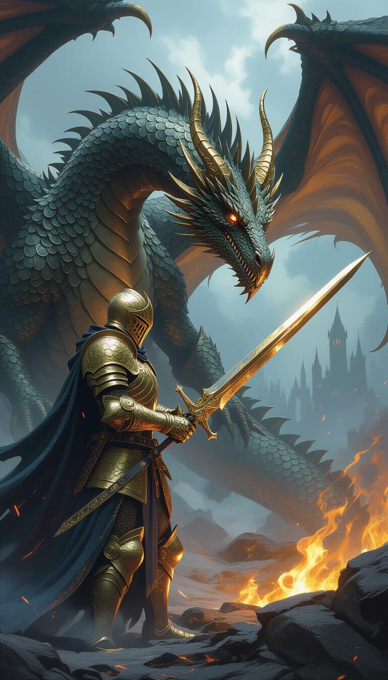 Amid a stormy scene in a fantastical world, a knight in armor that looks like melting gold is in a fierce battle. The digital painting captures the intense action and atmosphere. Every detail of the warrior's armor shines like liquid, drawing attention to its intricate design as it seems to melt under the pressure of the fight. The stormy background adds urgency and danger, enhancing the drama of the image. Rich colors and textures bring this epic moment to life with high artistic quality. A stoic knight with a dragon, a dark fantasy portrait, a sensual aura. Strong lighting, shadows, and highlights enhance the emotion. Gothic mood, mist, embers, and brooding architecture. Hyper-detailed, rich textures, intricate armor, lifelike scales.