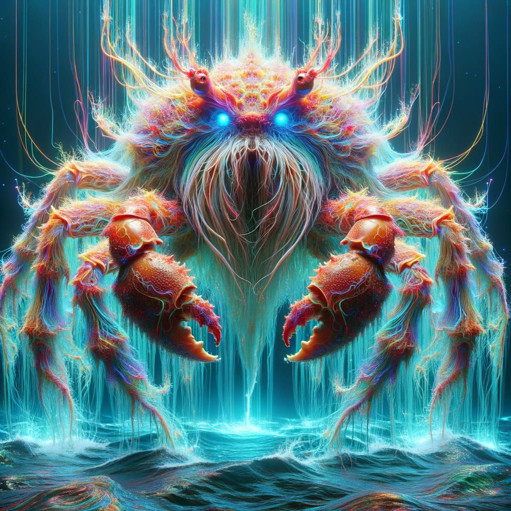 This image shows a crab-humanoid hybrid in an underwater scene. The creature has a crab shell torso, claws, and crab-like legs, with a face blending crab and human features amidst luminous energy.