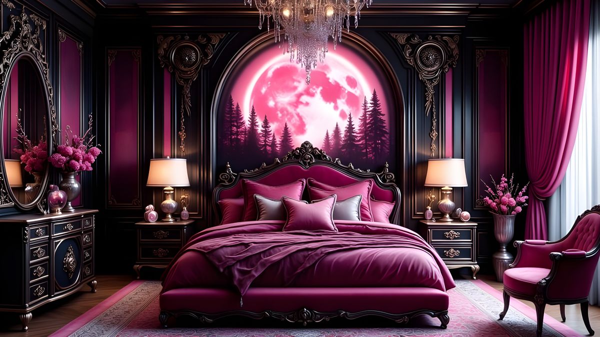 Pinkoween Moon bedroom exuding high-contrast moody romance and subtle Halloween mystique.