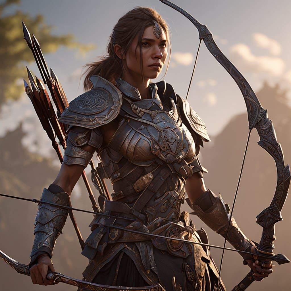 This detailed digital painting depicts a female warrior in intricate armor, poised for battle with a bow and arrow, featuring an ethereal glow and complementary colors.