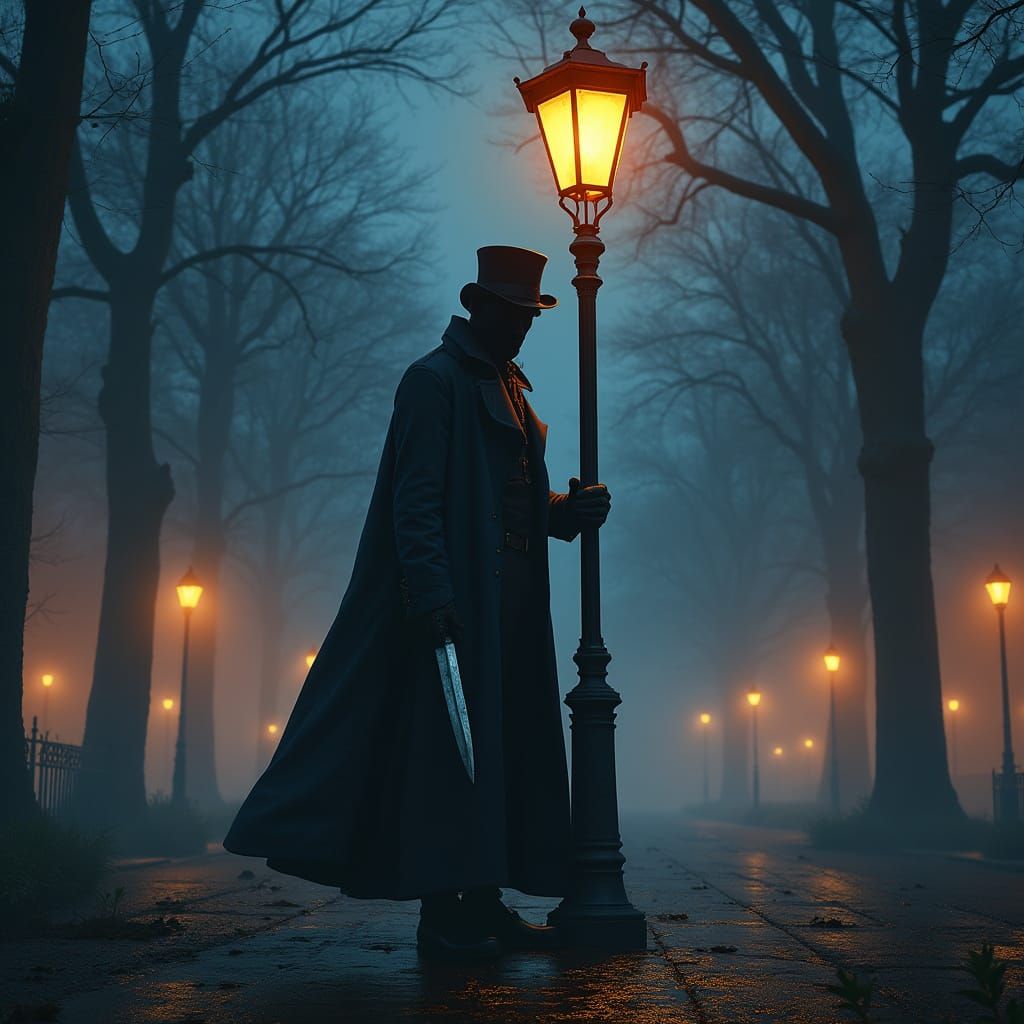 A hyperrealistic image of a figure resembling Jack the Ripper in a foggy London park. The scene is vividly detailed, with dramatic lighting and a colorful backdrop, reminiscent of concept art.