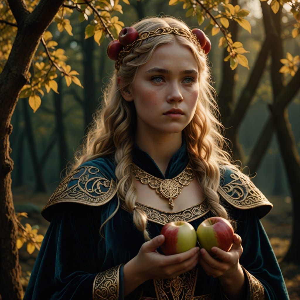 A hyperrealistic image of a Nordic goddess holding apples. The 18-year-old female figure with blonde hair and brown eyes is set against a dark background with cinematic lighting, in a film still aesthetic.