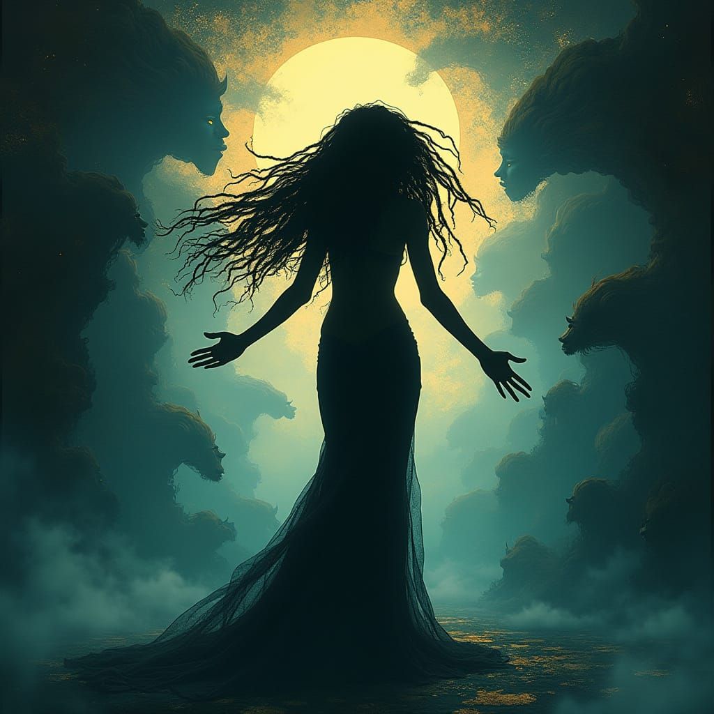 This enchanting image depicts a serene Black woman standing amidst swirling shadows, her figure aglow with an inner light. The scene is set in a dreamlike, ethereal space with muted indigo tones, deep jade accents, and a timeless, mystical aura.