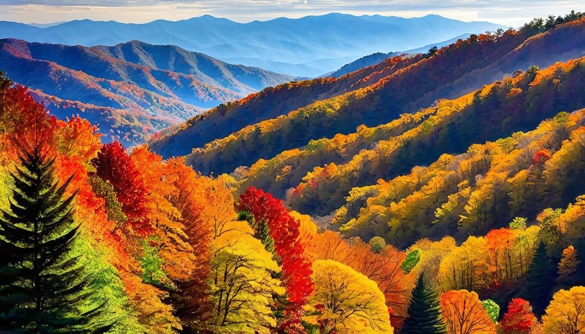 This image depicts the Great Smoky Mountains during the autumn season, rendered in a soft and expressive watercolor style.