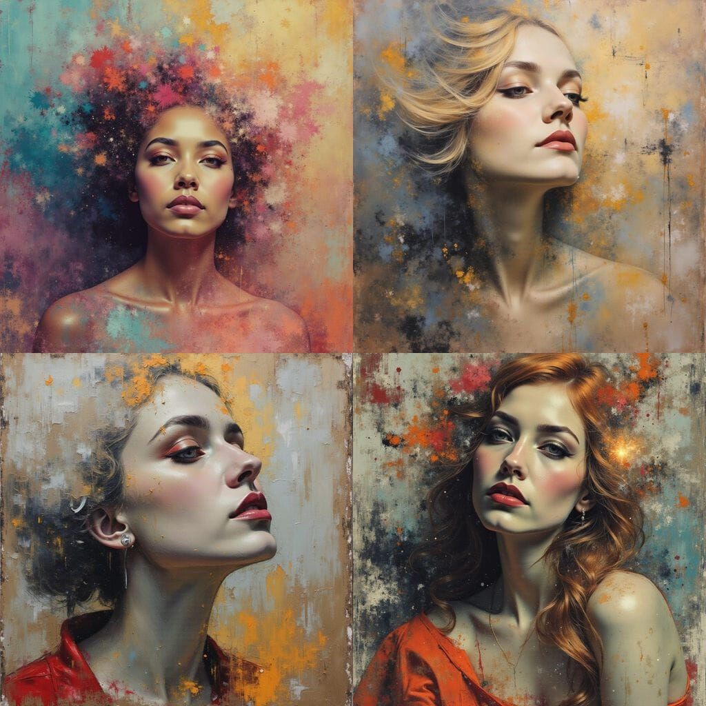 This image is a messy oil portrait of a woman's face, rendered with a sparkling collage effect and displacement. The artwork captures a raw, emotional portrayal.