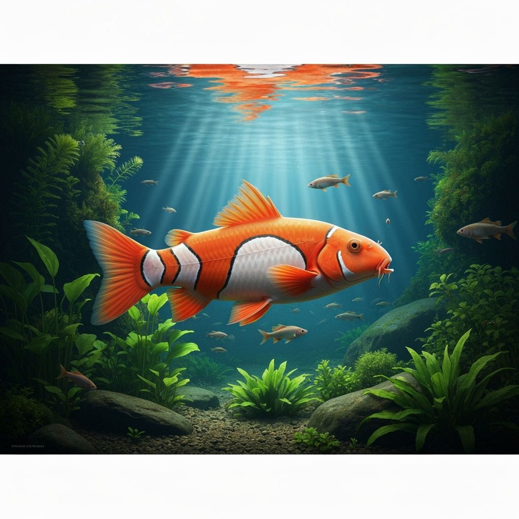 This image shows a clownfish and loach fantasy hybrid in a large natural pond. The underwater view is a highly detailed scientific illustration with dramatic lighting and matte painting.