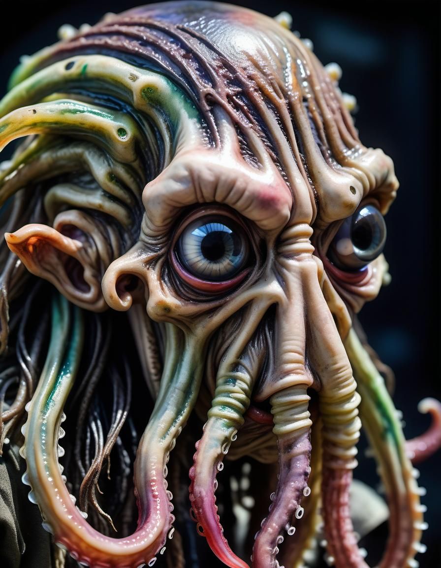 A striking picture of a deformed pirate character with tentacles, reminiscent of Davy Jones. The artwork features deep colors, sunset lighting, and intricate details in a chiaroscuro style.