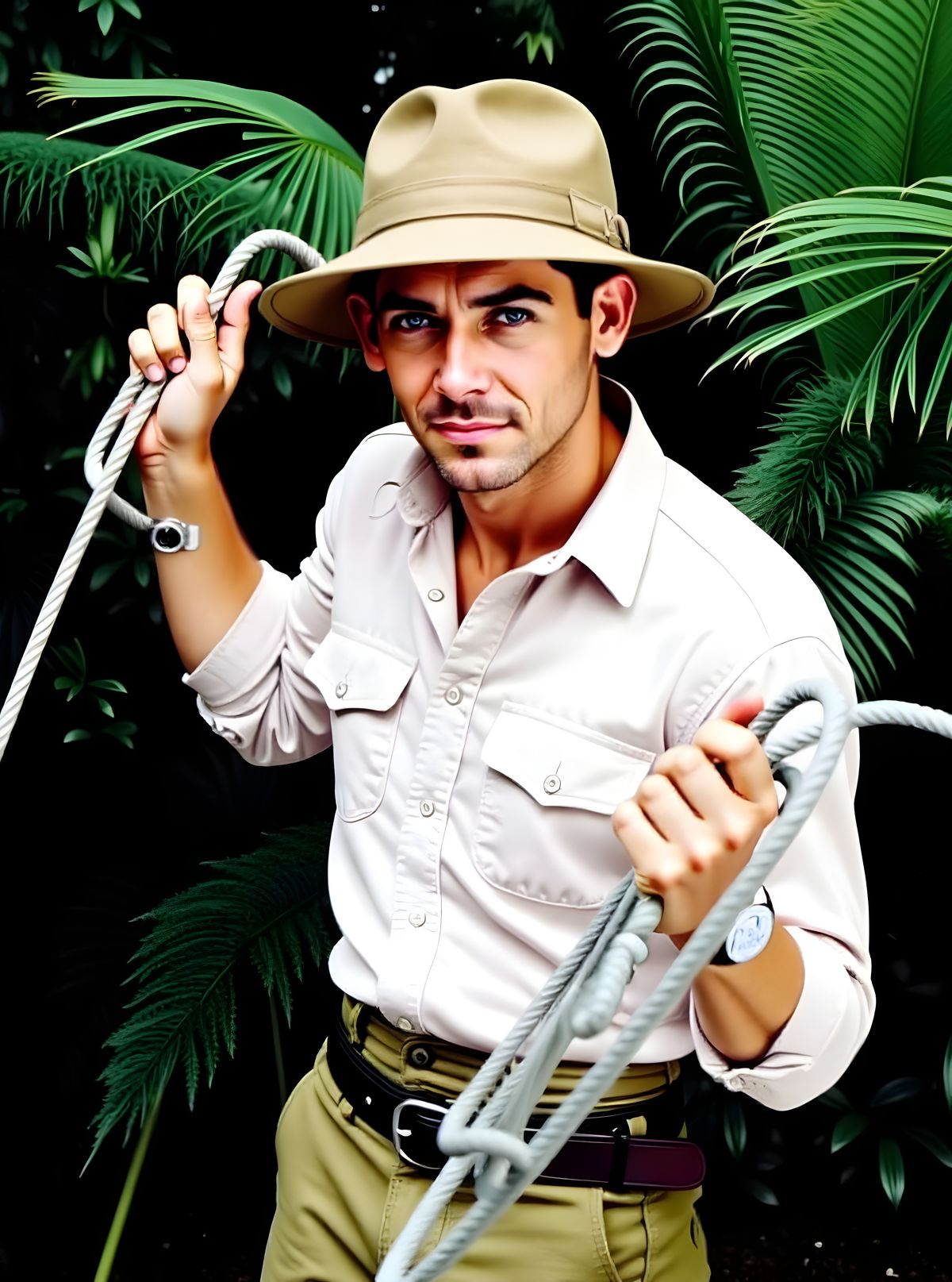 This image shows a daring jungle adventurer in 1930s Singapore, next to his seaplane. The scene is filled with bustling docks, exotic cargo, and steamy equatorial atmosphere, in a vintage pulp magazine style.