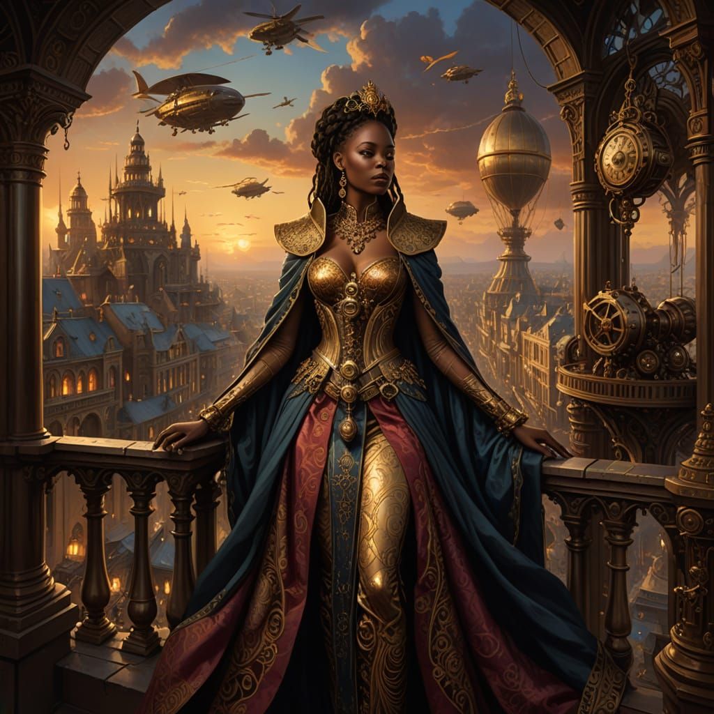 This image depicts a regal African queen on a balcony, overlooking a detailed steampunk metropolis with airships in a twilight sky. Rendered as a rich, oil-style digital matte painting with cinematic lighting.