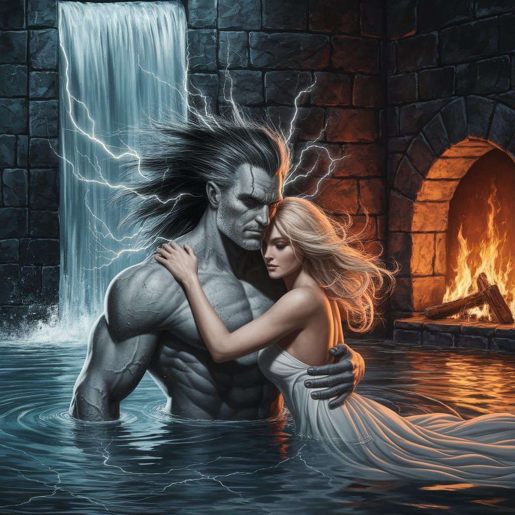 A mystical scene of a powerful knight and a beautiful woman embracing in a dimly lit medieval castle chamber, surrounded by a massive lake and a roaring waterfall. The atmosphere is warm and enchanting, with flickering flames and ancient stone walls.
