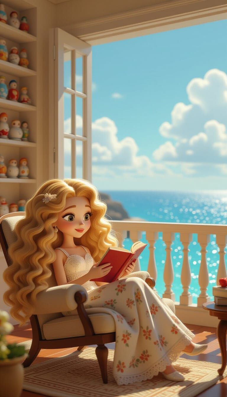 This image shows a 3D animated character resembling a string doll, with curly blonde hair, reading a book on a balcony. The scene features a detailed background with shelves and a beautiful ocean view.