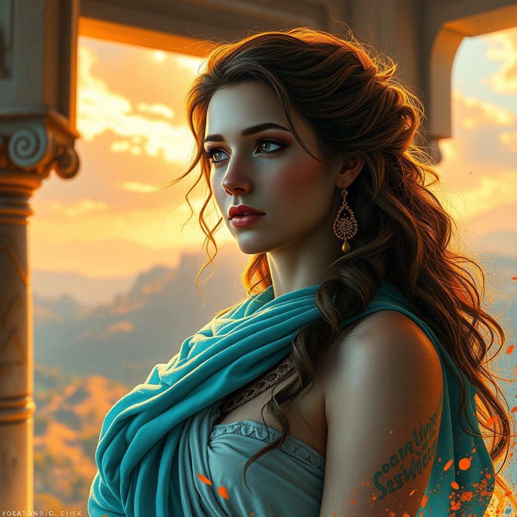 A stunning image of a Greek woman set in a palace on Mount Olympus, featuring intricate details and vibrant triadic colors reminiscent of Alphonse Mucha's Art Nouveau style.