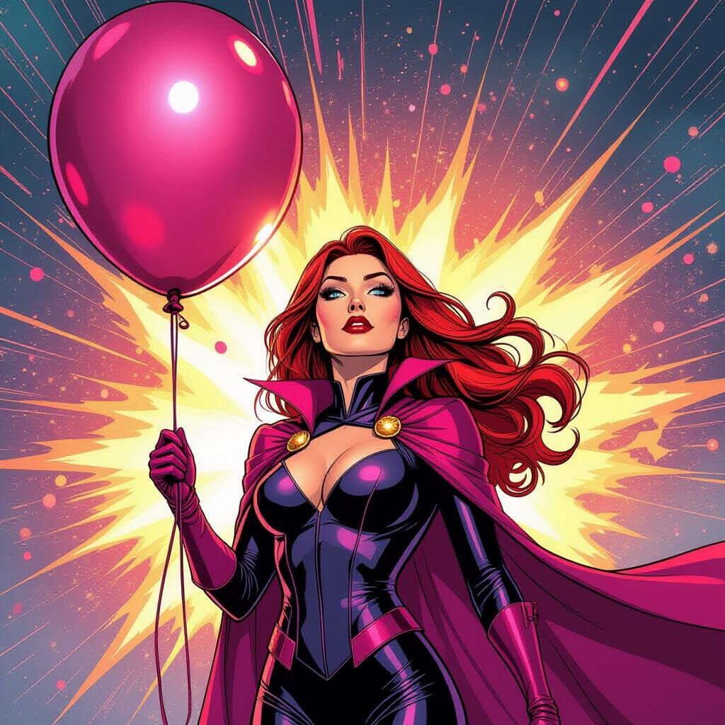 This image shows Scarlet Witch holding a large, glittering birthday balloon, with cosmic energy in the background. The vibrant colors and dynamic textures create a comic book aesthetic.