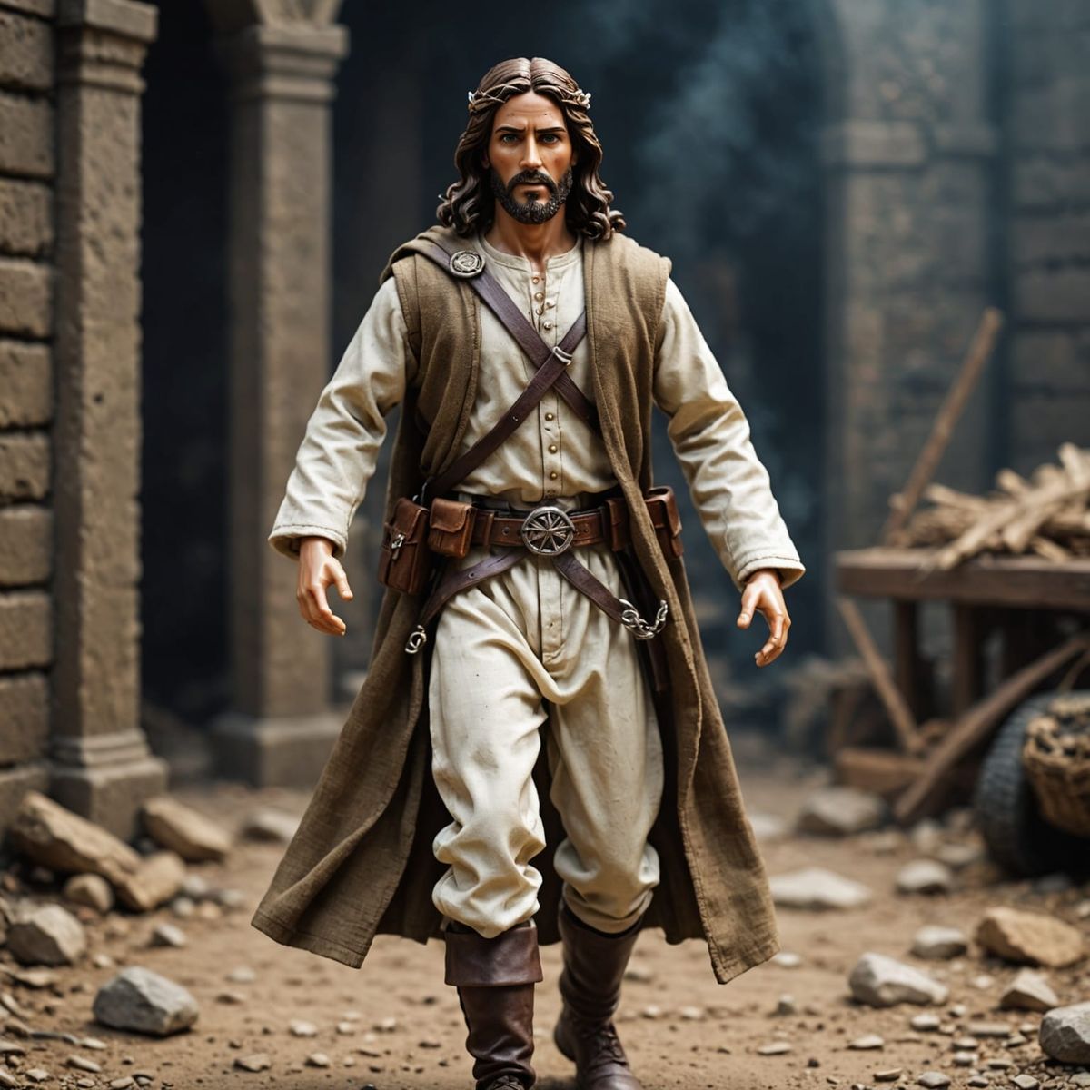 This image showcases a beautifully rendered action figure of Jesus in its display package, featuring intricate details and a cinematic atmosphere with high contrast and sharp focus.