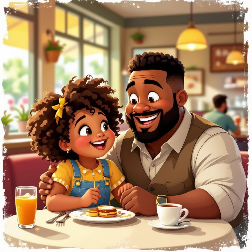 This image shows a joyful Father's Day celebration at a restaurant. A golden-brown-skinned little girl with a wide smile celebrates with her father in an animation cel style, reminiscent of Pixar and Glen Keane.